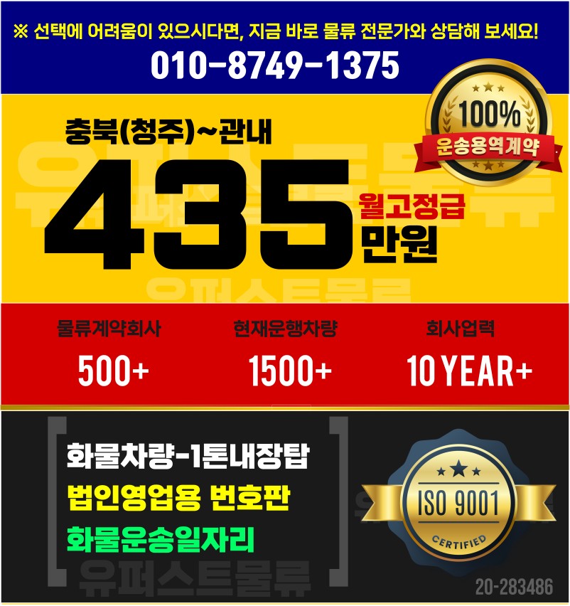 1톤정보 ★유명프랜차이즈 (08:00~17:00 / 단일품목(경량짐) / 나이무관 /오토차량가능 / 증차분) (당사차량)