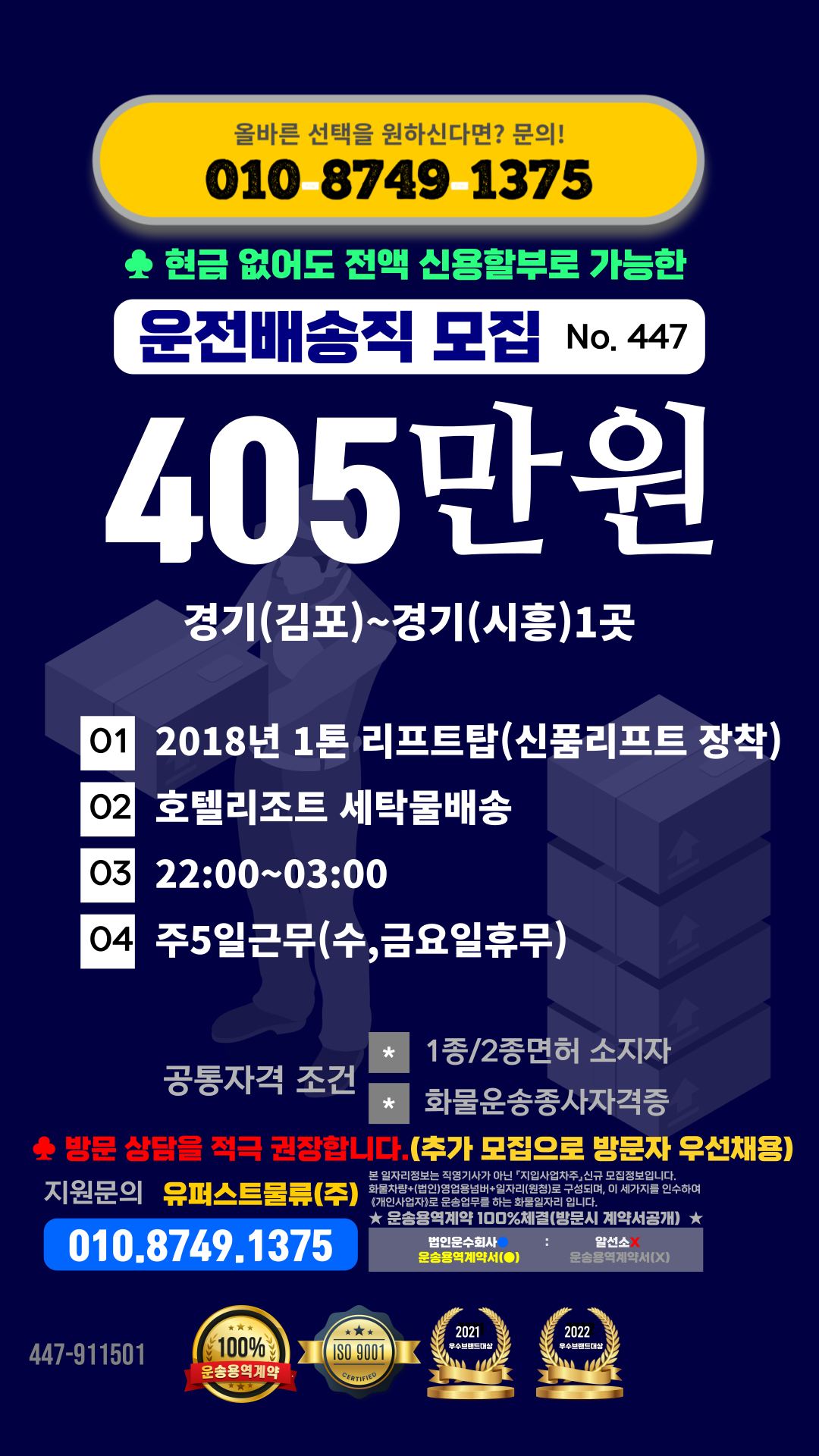 1톤정보 ★호텔리조트세탁물(22:00~03:00 / 1곳배송/ 롤테이너작업 / 오토차량가능 / 증차분) 주5일근무 (당사차량)