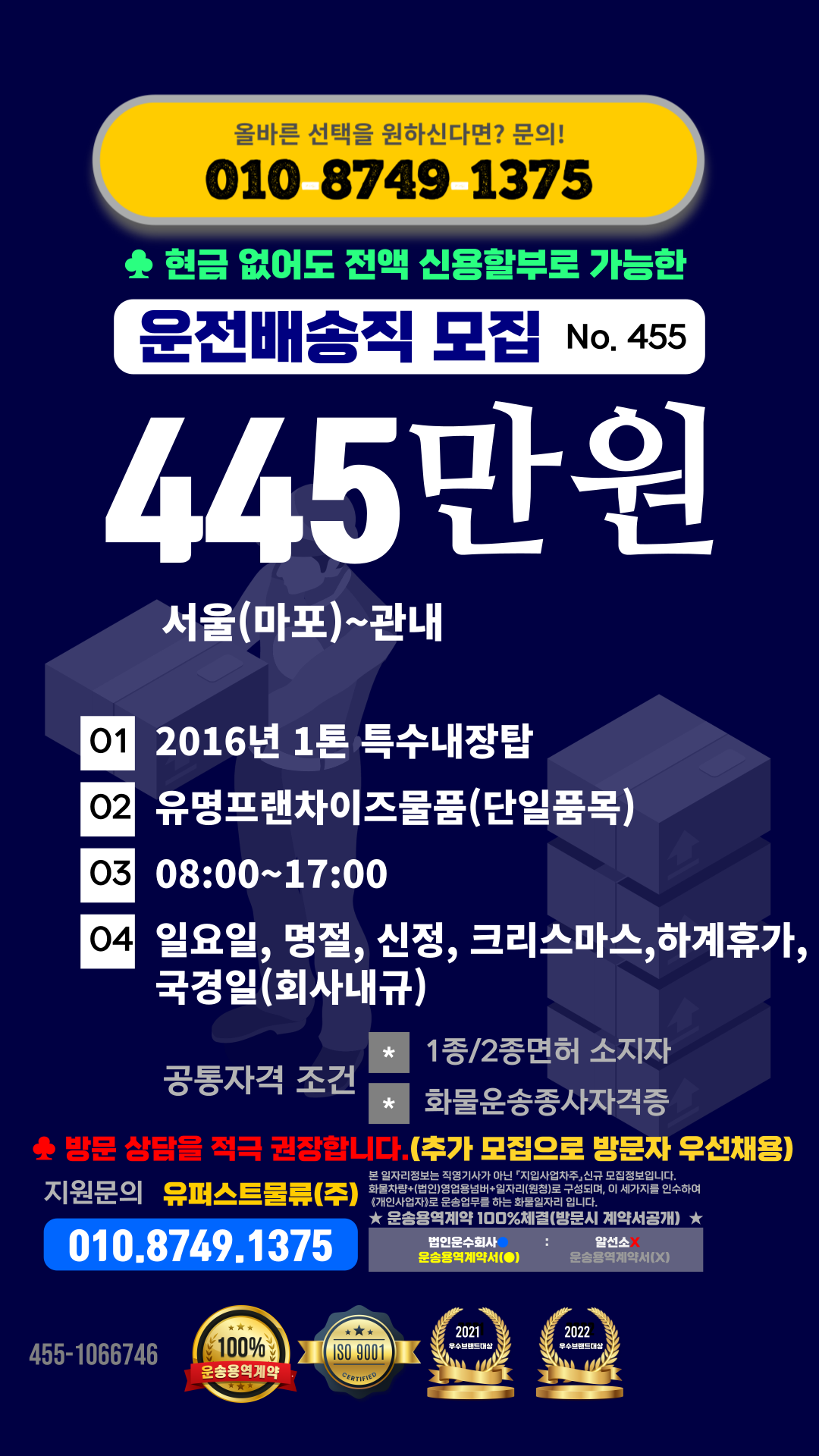 1톤정보 ★유명프랜차이즈 (08:00~17:00 / 단일품목(경량짐) / 나이무관 /오토차량가능 / 연차휴가11일 있음 / 증차분) …