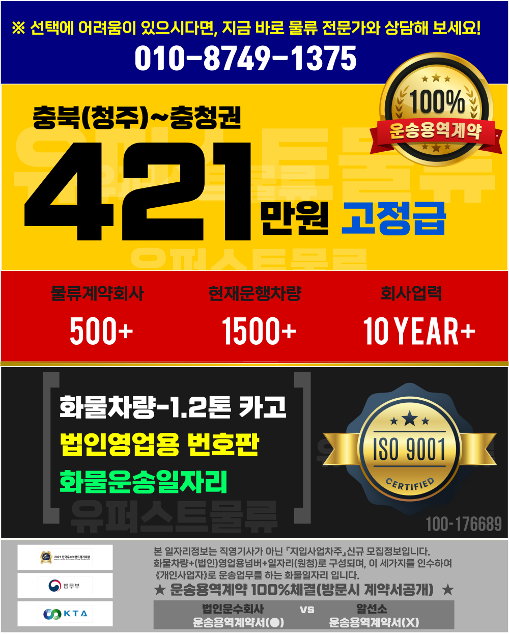 1톤정보 【충북(청주)~충청권 】421만원 (완제) +유보금최대35만,유명마트공산품,08:00~17:00 2배송 현지퇴근