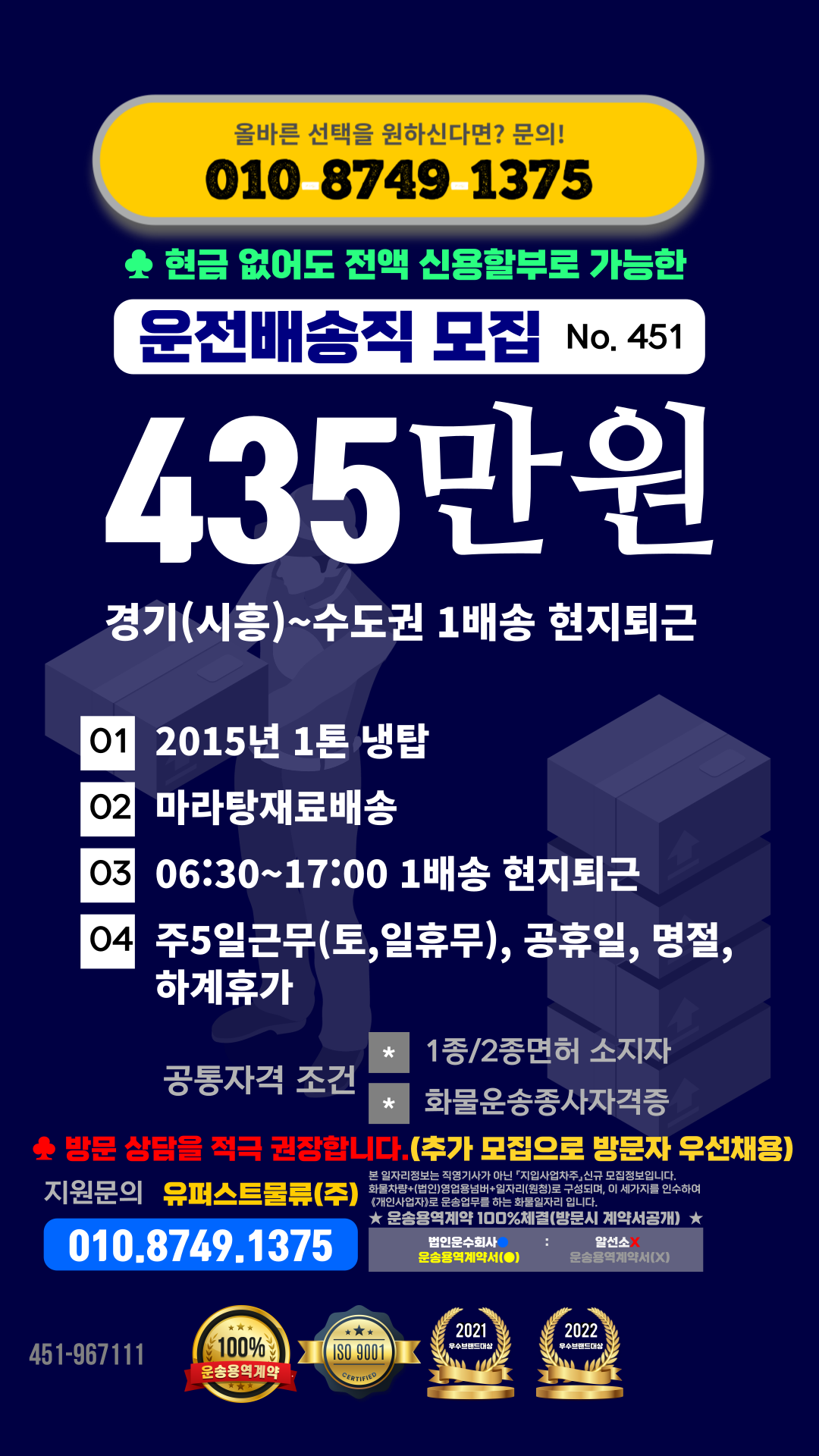 * 한번 물건 싣고 하루 20~25곳내외 수도권 거래처 배송하고 현지에서 퇴근하시면 됩니다.