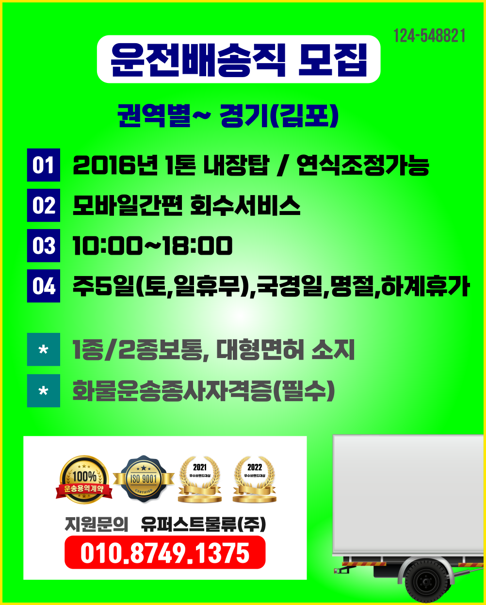 1톤정보 ★모바일간편 회수서비스 ( 10:00~18:00 / 오토차량가능 / 일수월함 / 비대면 / 증차분) 주5일근무 (당사차량)
