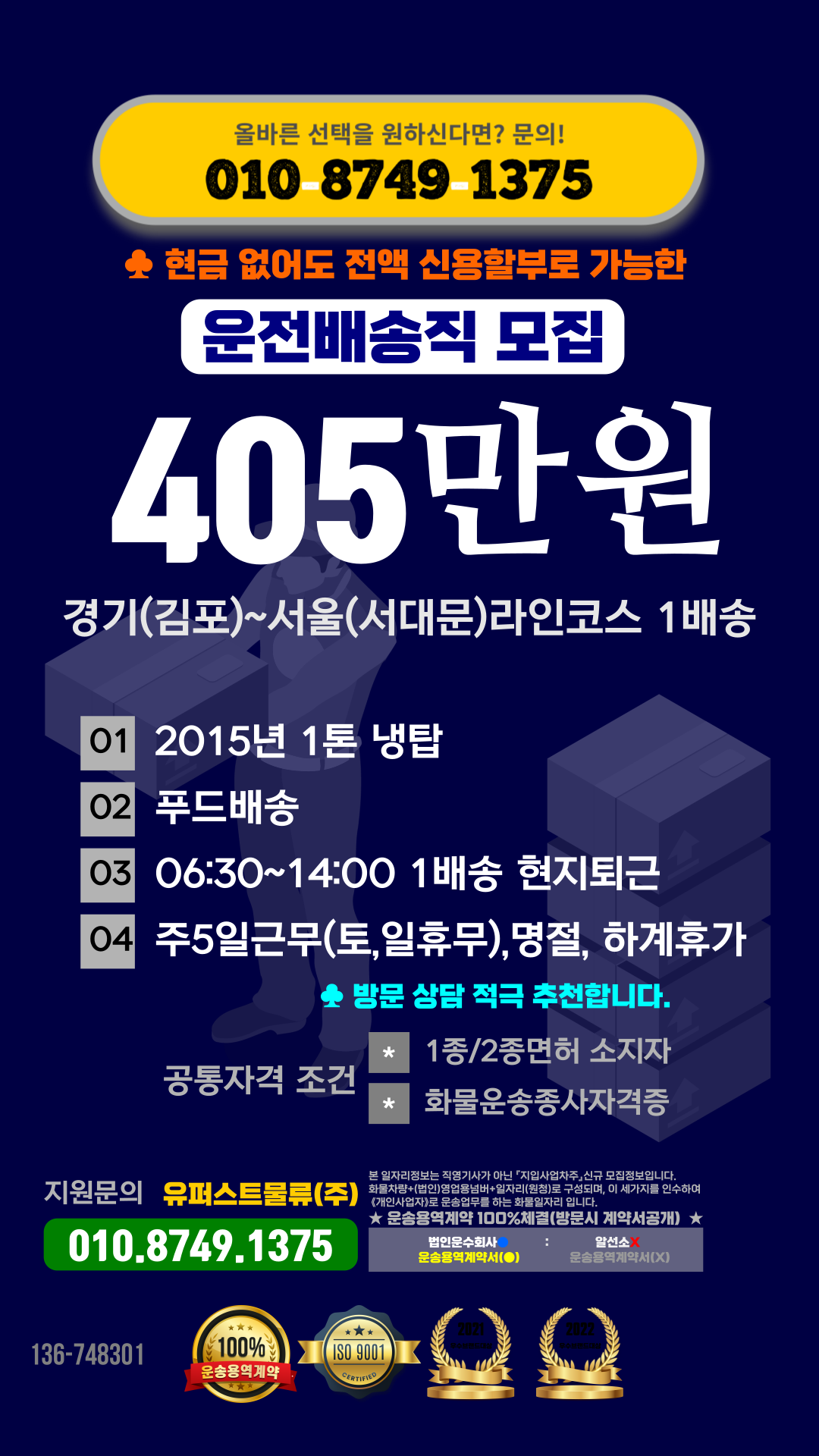 1톤정보 ★자체운영food배송 (06:30~14:00 현지퇴근 / 투잡가능 / 오토차량가능 / 증차분) 주5일근무 (당사차량)