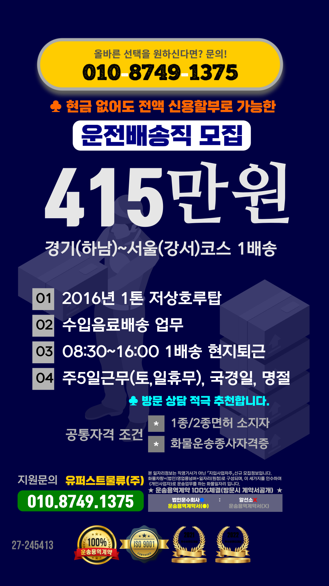 * 거래처에 하루 15곳 내외로 배송하고 현지에서 퇴근하시면 됩니다.