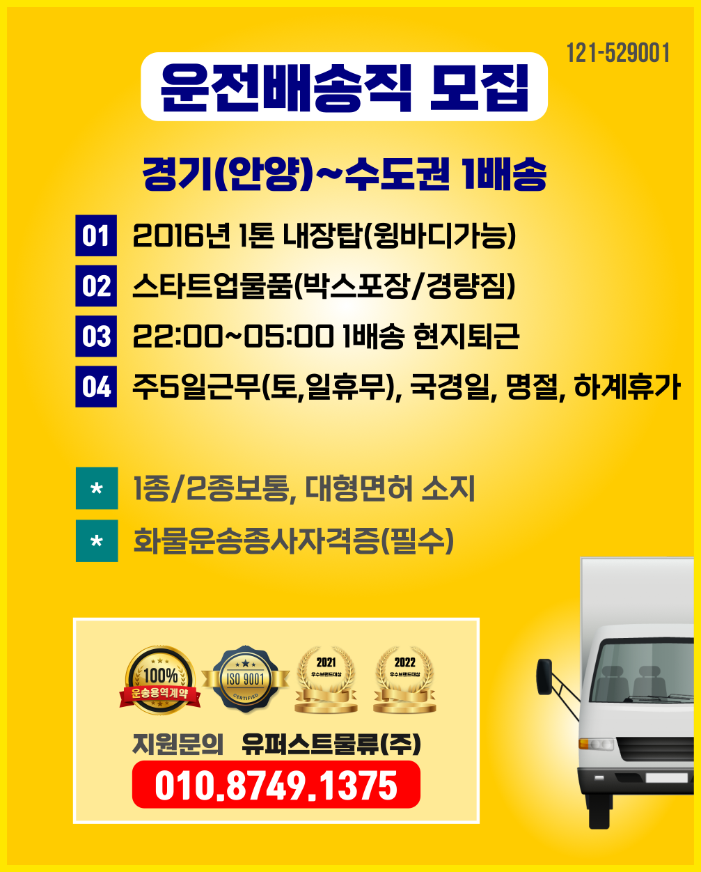 * 경기(안양)센터에서 물품 상차후 거래처10곳 정도 배송후 현지에서 퇴근 하시면 됩니다.