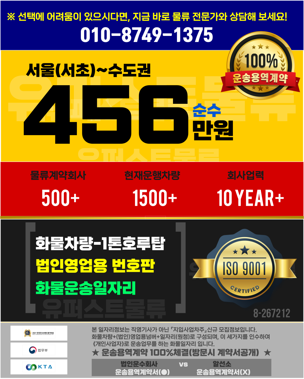* 1개월 적응기간 이후 1일 최소 물량 및 단가 12건이상(18만원이상 부가세포함) 배차조건 입니다.(계약서 명시함)