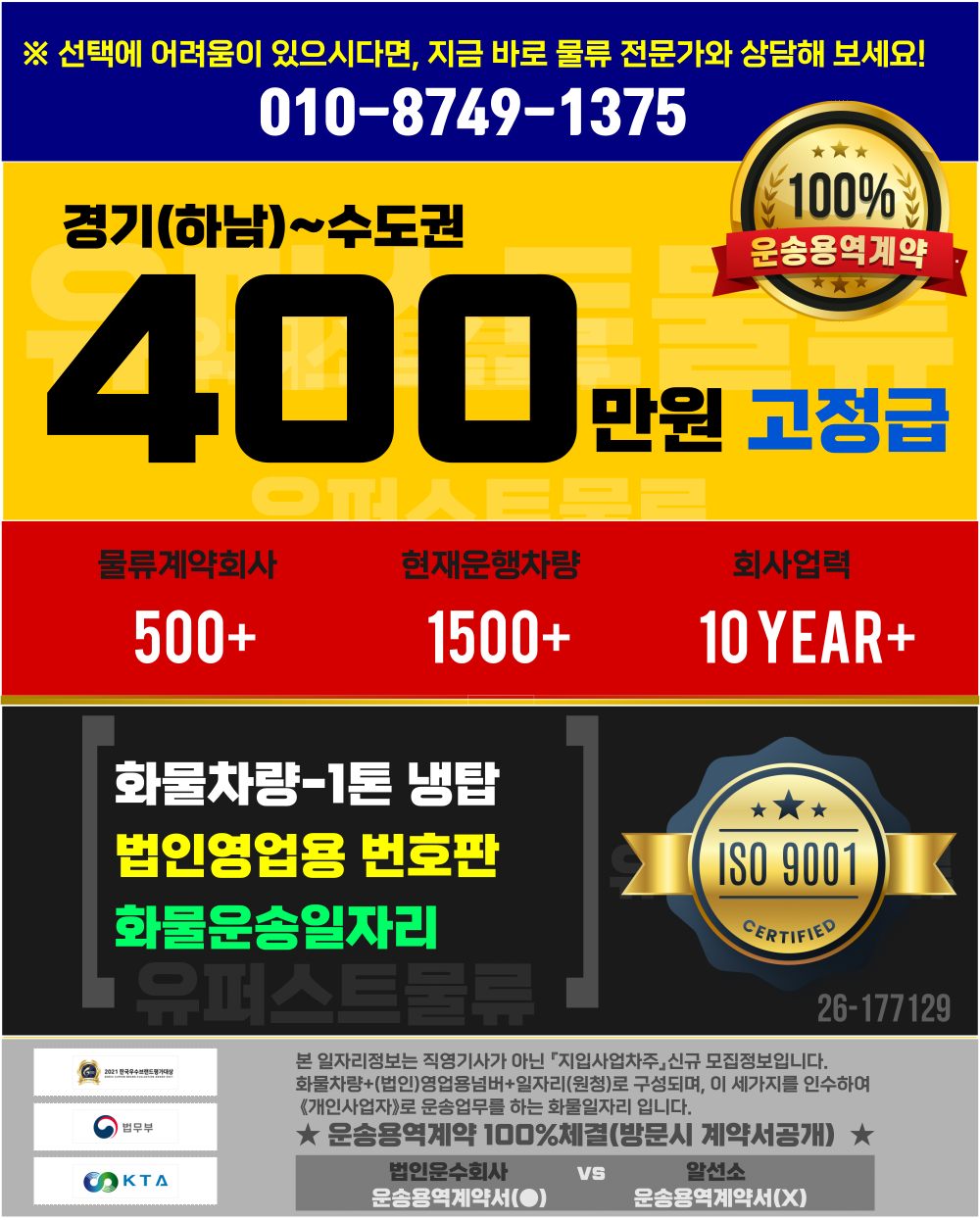 본 정보는 ①화물차량+②(법인)영업용넘버+③일자리(원청)로 구성된 화물운송 업무 채용정보 입니다.